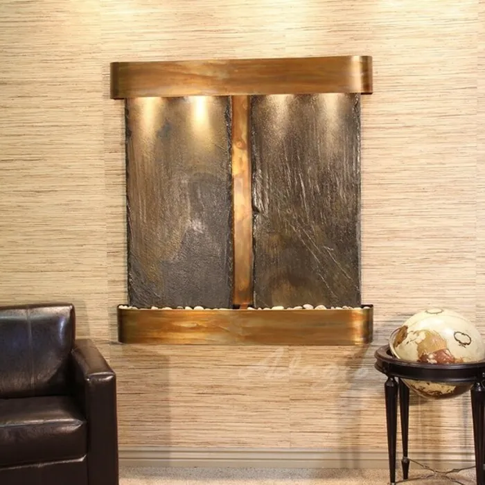 The Aspen Falls Collection offers the tranquility of water in motion falling over 2 beautiful Natural Slate, Marble, Featherstone, or Mirror surfaces. Adagio Water Features represents the best the industry has to offer. *Comes complete with Polished River Rocks, Halogen lighting, and 2 pumps. *Comes with EZ Installation Instructions and DVD. *On/Off pull chain allows you to run lights only, water only, or water and lights together. *Dimmer Switch allows you to adjust the lighting to produce the desired ambiance. *Optional: Stone Selection, LED lights w/ remote, Black Polished Pebbles, Customized Logo and Water Distillers are available. *