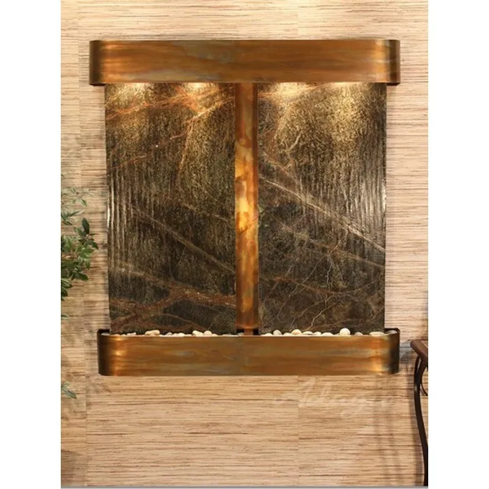 The Aspen Falls Collection offers the tranquility of water in motion falling over 2 beautiful Natural Slate, Marble, Featherstone, or Mirror surfaces. Adagio Water Features represents the best the industry has to offer. *Comes complete with Polished River Rocks, Halogen lighting, and 2 pumps. *Comes with EZ Installation Instructions and DVD. *On/Off pull chain allows you to run lights only, water only, or water and lights together. *Dimmer Switch allows you to adjust the lighting to produce the desired ambiance. *Optional: Stone Selection, LED lights w/ remote, Black Polished Pebbles, Customized Logo and Water Distillers are available. *