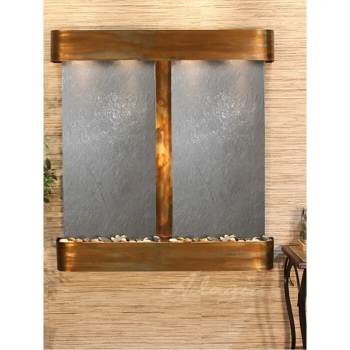 The Aspen Falls Collection offers the tranquility of water in motion falling over 2 beautiful Natural Slate, Marble, Featherstone, or Mirror surfaces. Adagio Water Features represents the best the industry has to offer. *Comes complete with Polished River Rocks, Halogen lighting, and 2 pumps. *Comes with EZ Installation Instructions and DVD. *On/Off pull chain allows you to run lights only, water only, or water and lights together. *Dimmer Switch allows you to adjust the lighting to produce the desired ambiance. *Optional: Stone Selection, LED lights w/ remote, Black Polished Pebbles, Customized Logo and Water Distillers are available. *
