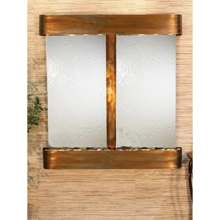 The Aspen Falls Collection offers the tranquility of water in motion falling over 2 beautiful Natural Slate, Marble, Featherstone, or Mirror surfaces. Adagio Water Features represents the best the industry has to offer. *Comes complete with Polished River Rocks, Halogen lighting, and 2 pumps. *Comes with EZ Installation Instructions and DVD. *On/Off pull chain allows you to run lights only, water only, or water and lights together. *Dimmer Switch allows you to adjust the lighting to produce the desired ambiance. *Optional: Stone Selection, LED lights w/ remote, Black Polished Pebbles, Customized Logo and Water Distillers are available. *
