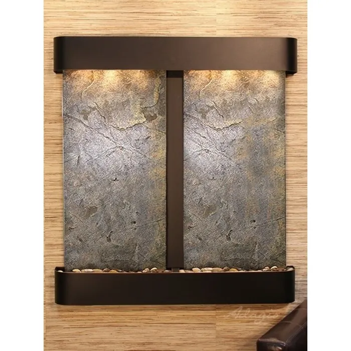 The Aspen Falls Collection offers the tranquility of water in motion falling over 2 beautiful Natural Slate, Marble, Featherstone, or Mirror surfaces. Adagio Water Features represents the best the industry has to offer. *Comes complete with Polished River Rocks, Halogen lighting, and 2 pumps. *Comes with EZ Installation Instructions and DVD. *On/Off pull chain allows you to run lights only, water only, or water and lights together. *Dimmer Switch allows you to adjust the lighting to produce the desired ambiance. *Optional: Stone Selection, LED lights w/ remote, Black Polished Pebbles, Customized Logo and Water Distillers are available. *