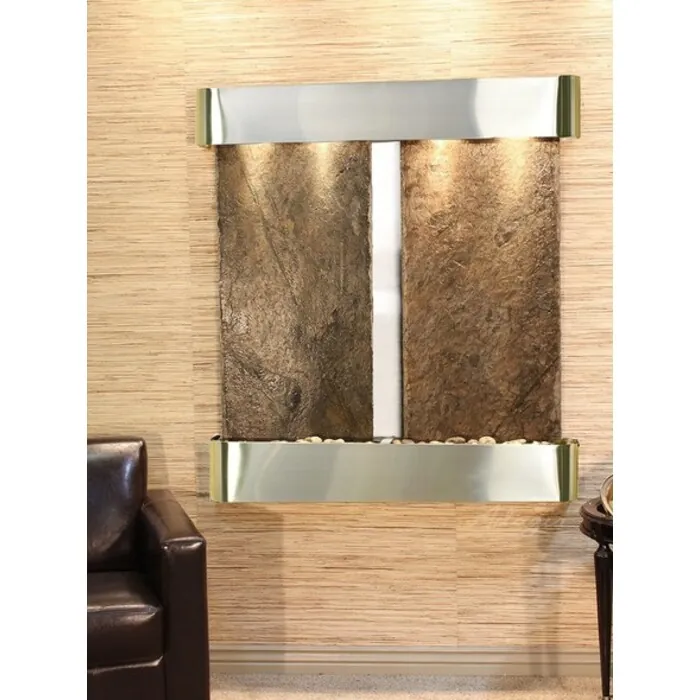 The Aspen Falls Collection offers the tranquility of water in motion falling over 2 beautiful Natural Slate, Marble, Featherstone, or Mirror surfaces. Adagio Water Features represents the best the industry has to offer. *Comes complete with Polished River Rocks, Halogen lighting, and 2 pumps. *Comes with EZ Installation Instructions and DVD. *On/Off pull chain allows you to run lights only, water only, or water and lights together. *Dimmer Switch allows you to adjust the lighting to produce the desired ambiance. *Optional: Stone Selection, LED lights w/ remote, Black Polished Pebbles, Customized Logo and Water Distillers are available. *