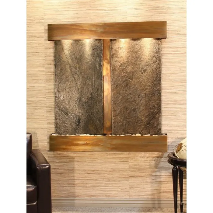 The Aspen Falls Collection offers the tranquility of water in motion falling over 2 beautiful Natural Slate, Marble, Featherstone, or Mirror surfaces. Adagio Water Features represents the best the industry has to offer. *Comes complete with Polished River Rocks, Halogen lighting, and 2 pumps. *Comes with EZ Installation Instructions and DVD. *On/Off pull chain allows you to run lights only, water only, or water and lights together. *Dimmer Switch allows you to adjust the lighting to produce the desired ambiance. *Optional: Stone Selection, LED lights w/ remote, Black Polished Pebbles, Customized Logo and Water Distillers are available. *