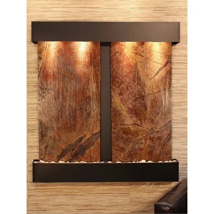 The Aspen Falls Collection offers the tranquility of water in motion falling over 2 beautiful Natural Slate, Marble, Featherstone, or Mirror surfaces. Adagio Water Features represents the best the industry has to offer. *Comes complete with Polished River Rocks, Halogen lighting, and 2 pumps. *Comes with EZ Installation Instructions and DVD. *On/Off pull chain allows you to run lights only, water only, or water and lights together. *Dimmer Switch allows you to adjust the lighting to produce the desired ambiance. *Optional: Stone Selection, LED lights w/ remote, Black Polished Pebbles, Customized Logo and Water Distillers are available. *