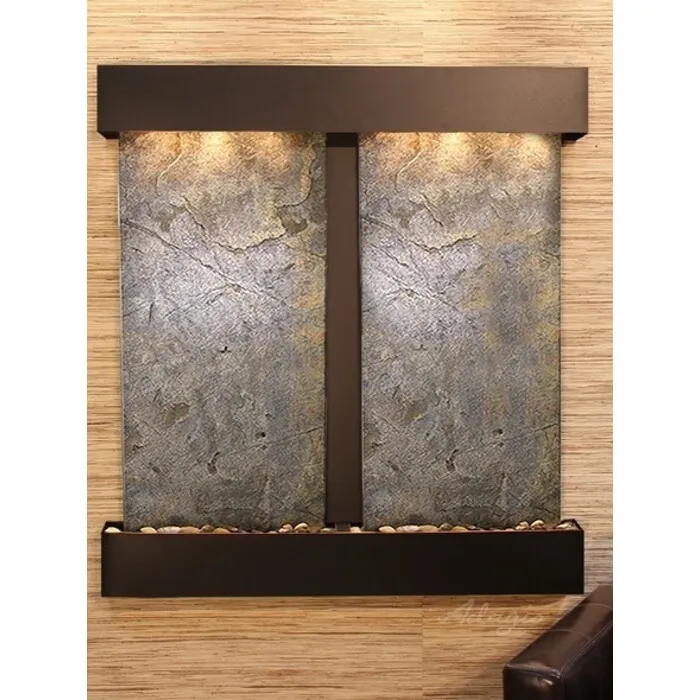 The Aspen Falls Collection offers the tranquility of water in motion falling over 2 beautiful Natural Slate, Marble, Featherstone, or Mirror surfaces. Adagio Water Features represents the best the industry has to offer. *Comes complete with Polished River Rocks, Halogen lighting, and 2 pumps. *Comes with EZ Installation Instructions and DVD. *On/Off pull chain allows you to run lights only, water only, or water and lights together. *Dimmer Switch allows you to adjust the lighting to produce the desired ambiance. *Optional: Stone Selection, LED lights w/ remote, Black Polished Pebbles, Customized Logo and Water Distillers are available. *