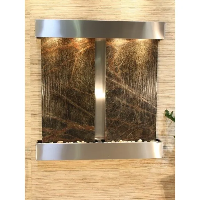The Aspen Falls Collection offers the tranquility of water in motion falling over 2 beautiful Natural Slate, Marble, Featherstone, or Mirror surfaces. Adagio Water Features represents the best the industry has to offer. *Comes complete with Polished River Rocks, Halogen lighting, and 2 pumps. *Comes with EZ Installation Instructions and DVD. *On/Off pull chain allows you to run lights only, water only, or water and lights together. *Dimmer Switch allows you to adjust the lighting to produce the desired ambiance. *Optional: Stone Selection, LED lights w/ remote, Black Polished Pebbles, Customized Logo and Water Distillers are available. *