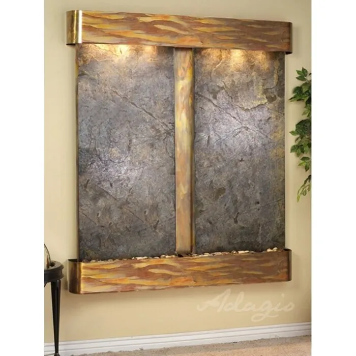 The Cottonwood Falls Collection offers the tranquility of water in motion falling over 2 beautiful Natural Slate, Marble, Travertine, Featherstone, or Mirror surfaces. Adagio Water Features represents the best the industry has to offer. *Comes complete with Polished River Rocks, Halogen lighting, and 2 pumps. *Comes with EZ Installation Instructions and DVD. *On/Off pull chain allows you to run lights only, water only, or water and lights together. *Dimmer Switch allows you to adjust the lighting to produce the desired ambiance. *Optional: Stone Selection, LED lights w/ remote, Black Polished Pebbles, Customized Logo and Water Distillers are available. *