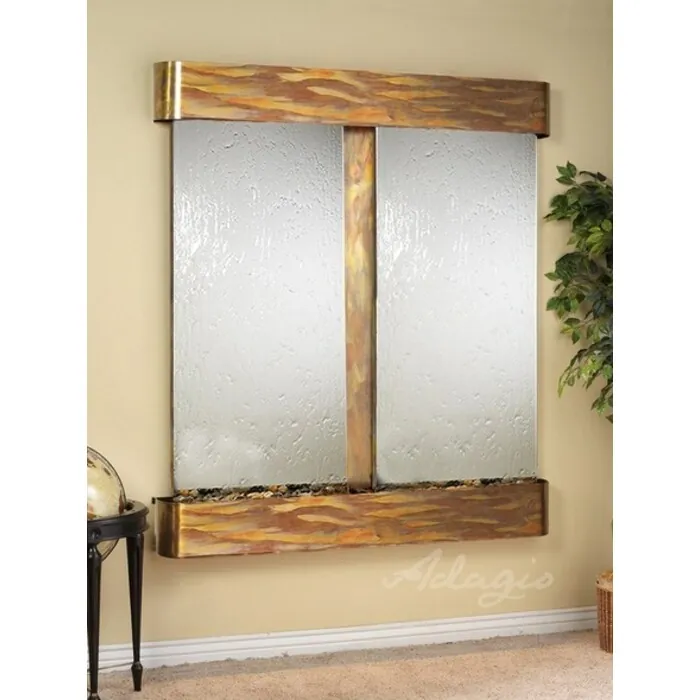 The Cottonwood Falls Collection offers the tranquility of water in motion falling over 2 beautiful Natural Slate, Marble, Travertine, Featherstone, or Mirror surfaces. Adagio Water Features represents the best the industry has to offer. *Comes complete with Polished River Rocks, Halogen lighting, and 2 pumps. *Comes with EZ Installation Instructions and DVD. *On/Off pull chain allows you to run lights only, water only, or water and lights together. *Dimmer Switch allows you to adjust the lighting to produce the desired ambiance. *Optional: Stone Selection, LED lights w/ remote, Black Polished Pebbles, Customized Logo and Water Distillers are available. *