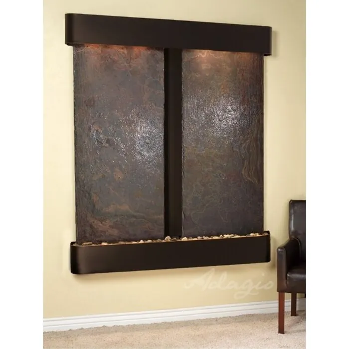 The Cottonwood Falls Collection offers the tranquility of water in motion falling over 2 beautiful Natural Slate, Marble, Travertine, Featherstone, or Mirror surfaces. Adagio Water Features represents the best the industry has to offer. *Comes complete with Polished River Rocks, Halogen lighting, and 2 pumps. *Comes with EZ Installation Instructions and DVD. *On/Off pull chain allows you to run lights only, water only, or water and lights together. *Dimmer Switch allows you to adjust the lighting to produce the desired ambiance. *Optional: Stone Selection, LED lights w/ remote, Black Polished Pebbles, Customized Logo and Water Distillers are available. *