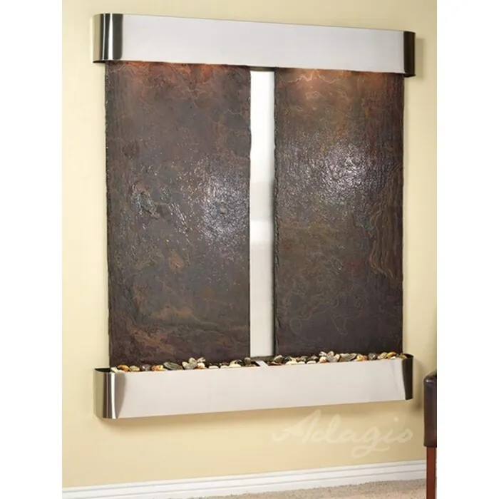 The Cottonwood Falls Collection offers the tranquility of water in motion falling over 2 beautiful Natural Slate, Marble, Travertine, Featherstone, or Mirror surfaces. Adagio Water Features represents the best the industry has to offer. *Comes complete with Polished River Rocks, Halogen lighting, and 2 pumps. *Comes with EZ Installation Instructions and DVD. *On/Off pull chain allows you to run lights only, water only, or water and lights together. *Dimmer Switch allows you to adjust the lighting to produce the desired ambiance. *Optional: Stone Selection, LED lights w/ remote, Black Polished Pebbles, Customized Logo and Water Distillers are available. *