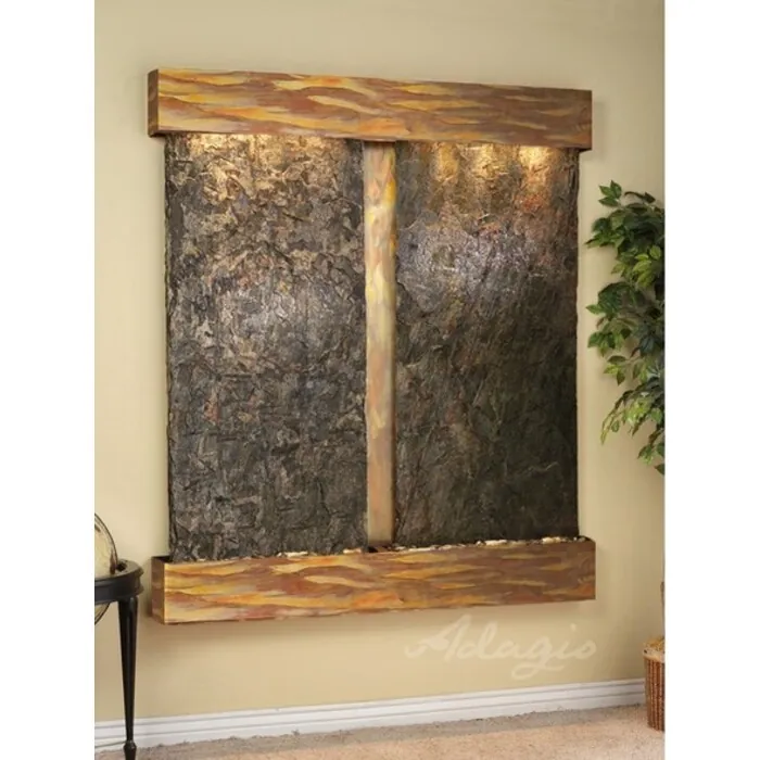 The Cottonwood Falls Collection offers the tranquility of water in motion falling over 2 beautiful Natural Slate, Marble, Travertine, Featherstone, or Mirror surfaces. Adagio Water Features represents the best the industry has to offer. *Comes complete with Polished River Rocks, Halogen lighting, and 2 pumps. *Comes with EZ Installation Instructions and DVD. *On/Off pull chain allows you to run lights only, water only, or water and lights together. *Dimmer Switch allows you to adjust the lighting to produce the desired ambiance. *Optional: Stone Selection, LED lights w/ remote, Black Polished Pebbles, Customized Logo and Water Distillers are available. *