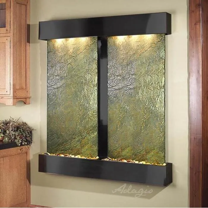 The Cottonwood Falls Collection offers the tranquility of water in motion falling over 2 beautiful Natural Slate, Marble, Travertine, Featherstone, or Mirror surfaces. Adagio Water Features represents the best the industry has to offer. *Comes complete with Polished River Rocks, Halogen lighting, and 2 pumps. *Comes with EZ Installation Instructions and DVD. *On/Off pull chain allows you to run lights only, water only, or water and lights together. *Dimmer Switch allows you to adjust the lighting to produce the desired ambiance. *Optional: Stone Selection, LED lights w/ remote, Black Polished Pebbles, Customized Logo and Water Distillers are available. *