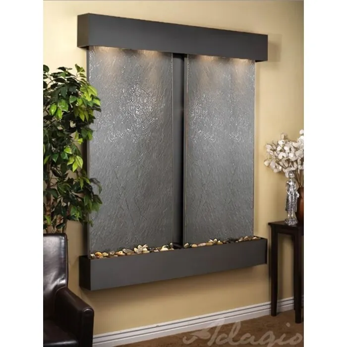 The Cottonwood Falls Collection offers the tranquility of water in motion falling over 2 beautiful Natural Slate, Marble, Travertine, Featherstone, or Mirror surfaces. Adagio Water Features represents the best the industry has to offer. *Comes complete with Polished River Rocks, Halogen lighting, and 2 pumps. *Comes with EZ Installation Instructions and DVD. *On/Off pull chain allows you to run lights only, water only, or water and lights together. *Dimmer Switch allows you to adjust the lighting to produce the desired ambiance. *Optional: Stone Selection, LED lights w/ remote, Black Polished Pebbles, Customized Logo and Water Distillers are available. *