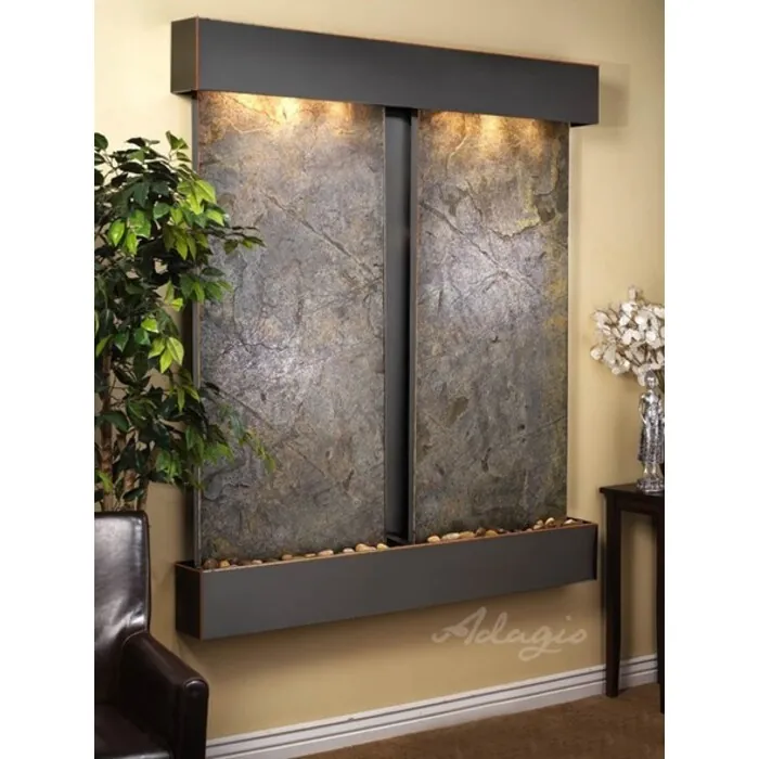 The Cottonwood Falls Collection offers the tranquility of water in motion falling over 2 beautiful Natural Slate, Marble, Travertine, Featherstone, or Mirror surfaces. Adagio Water Features represents the best the industry has to offer. *Comes complete with Polished River Rocks, Halogen lighting, and 2 pumps. *Comes with EZ Installation Instructions and DVD. *On/Off pull chain allows you to run lights only, water only, or water and lights together. *Dimmer Switch allows you to adjust the lighting to produce the desired ambiance. *Optional: Stone Selection, LED lights w/ remote, Black Polished Pebbles, Customized Logo and Water Distillers are available. *