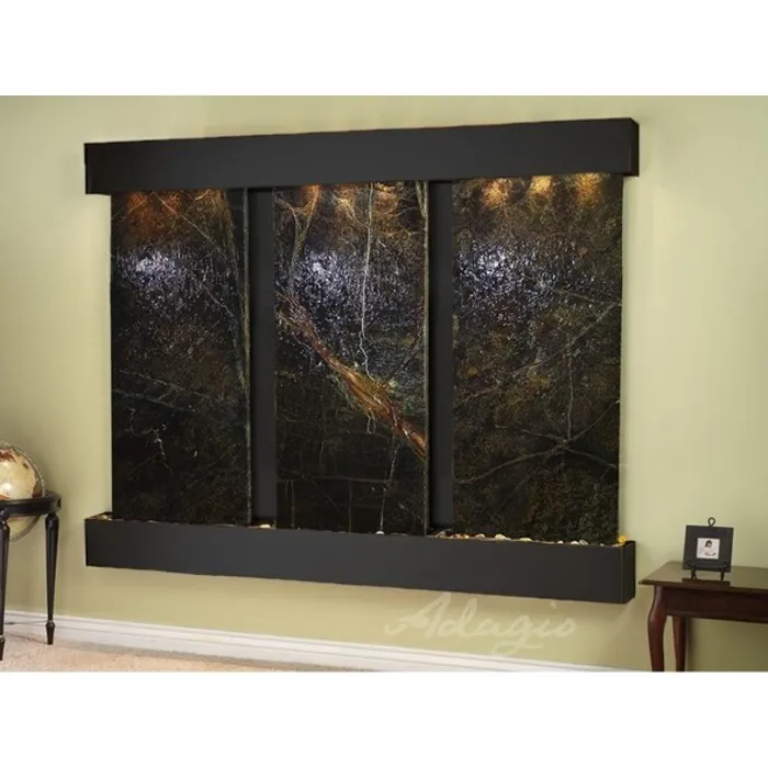 The Deep Creek Falls Collection offers the tranquility of water in motion falling over 3 beautiful Natural Slate, Marble, Travertine, Featherstone, or Mirror surfaces. Adagio Water Features represents the best the industry has to offer. *Comes complete with Polished River Rocks, Halogen lighting, and 3 pumps. *Comes with EZ Installation Instructions and DVD. *On/Off pull chain allows you to run lights only, water only, or water and lights together. *Dimmer Switch allows you to adjust the lighting to produce the desired ambiance. *Optional: Stone Selection, LED lights w/ remote, Black Polished Pebbles, Customized Logo and Water Distillers are available. *