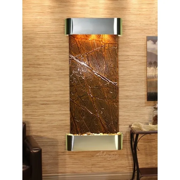 The Inspiration Falls Collection offers the tranquility of water in motion falling over a beautiful Natural Slate, Marble, Travertine, Featherstone, or Mirror surface. Adagio Water Features represents the best the industry has to offer. *Comes complete with Polished River Rocks, Halogen lighting, and 1 pump. *Comes with EZ Installation Instructions and DVD. *On/Off pull chain allows you to run lights only, water only, or water and lights together. *Dimmer Switch allows you to adjust the lighting to produce the desired ambiance. *Optional: Stone Selection, LED lights w/ remote, Black Polished Pebbles, Customized Logo and Water Distillers are available. *