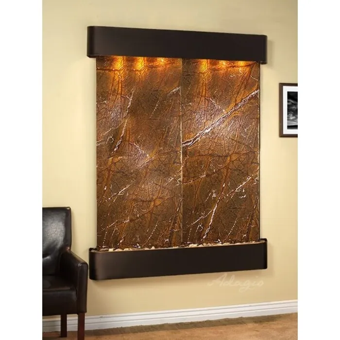 The Majestic River Collection offers the tranquility of water in motion falling over a beautiful Natural Slate, Marble or Travertine surface. Adagio Water Features represents the best the industry has to offer. *Comes complete with polished river rock, halogen lighting, and 2 pumps. *Comes with EZ Installation Instructions and DVD. *On/Off pull chain allows you to run lights only, water only, or water and lights together. *Dimmer Switch allows you to adjust the lighting to produce the desired ambiance. *Optional: Stone Selection, Led Lights w/ Remote, Black Polished Pebbles, Customized Logo and Water Distillers are available. *