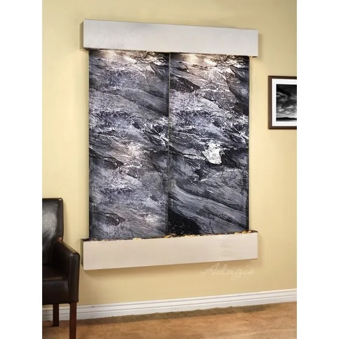 The Majestic River Collection offers the tranquility of water in motion falling over a beautiful Natural Slate, Marble or Travertine surface. Adagio Water Features represents the best the industry has to offer. *Comes complete with polished river rock, halogen lighting, and 2 pumps. *Comes with EZ Installation Instructions and DVD. *On/Off pull chain allows you to run lights only, water only, or water and lights together. *Dimmer Switch allows you to adjust the lighting to produce the desired ambiance. *Optional: Stone Selection, Led Lights w/ Remote, Black Polished Pebbles, Customized Logo and Water Distillers are available. *