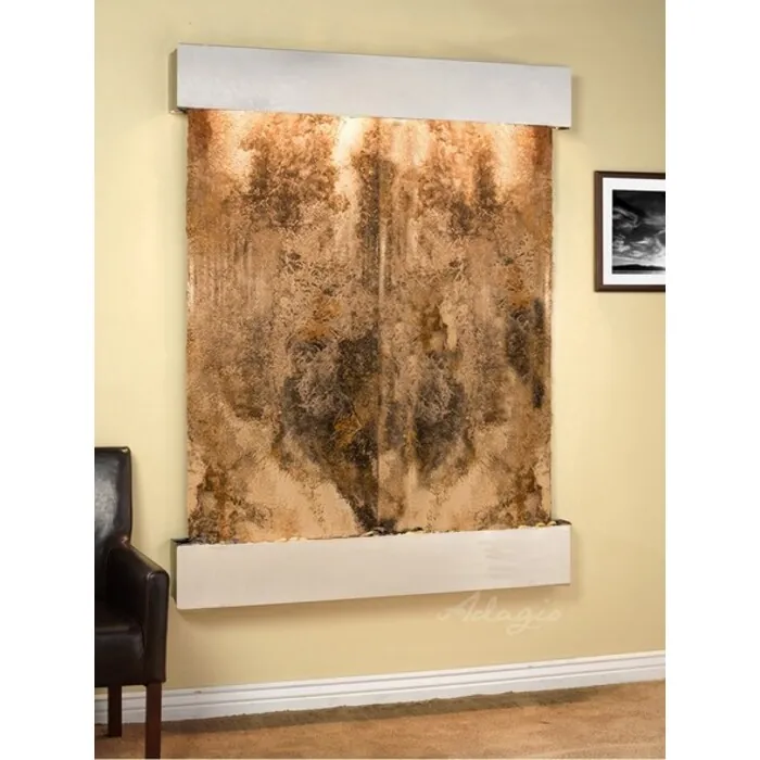 The Majestic River Collection offers the tranquility of water in motion falling over a beautiful Natural Slate, Marble or Travertine surface. Adagio Water Features represents the best the industry has to offer. *Comes complete with polished river rock, halogen lighting, and 2 pumps. *Comes with EZ Installation Instructions and DVD. *On/Off pull chain allows you to run lights only, water only, or water and lights together. *Dimmer Switch allows you to adjust the lighting to produce the desired ambiance. *Optional: Stone Selection, Led Lights w/ Remote, Black Polished Pebbles, Customized Logo and Water Distillers are available. *