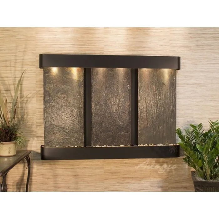 The Olympus Falls Collection offers the tranquility of water in motion falling over 3 beautiful Natural Slate, Marble, Featherstone, or Mirror surfaces. Adagio Water Features represents the best the industry has to offer. *Comes complete with Polished River Rocks, Halogen lighting, and 3 pumps. *Comes with EZ Installation Instructions and DVD. *On/Off pull chain allows you to run lights only, water only, or water and lights together. *Dimmer Switch allows you to adjust the lighting to produce the desired ambiance. *Optional: Stone Selection, LED lights w/ remote, Black Polished Pebbles, Customized Logo and Water Distillers are available. *
