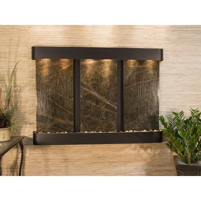 The Olympus Falls Collection offers the tranquility of water in motion falling over 3 beautiful Natural Slate, Marble, Featherstone, or Mirror surfaces. Adagio Water Features represents the best the industry has to offer. *Comes complete with Polished River Rocks, Halogen lighting, and 3 pumps. *Comes with EZ Installation Instructions and DVD. *On/Off pull chain allows you to run lights only, water only, or water and lights together. *Dimmer Switch allows you to adjust the lighting to produce the desired ambiance. *Optional: Stone Selection, LED lights w/ remote, Black Polished Pebbles, Customized Logo and Water Distillers are available. *