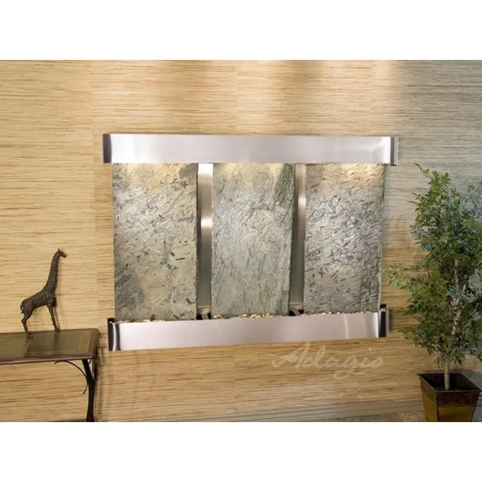 The Olympus Falls Collection offers the tranquility of water in motion falling over 3 beautiful Natural Slate, Marble, Featherstone, or Mirror surfaces. Adagio Water Features represents the best the industry has to offer. *Comes complete with Polished River Rocks, Halogen lighting, and 3 pumps. *Comes with EZ Installation Instructions and DVD. *On/Off pull chain allows you to run lights only, water only, or water and lights together. *Dimmer Switch allows you to adjust the lighting to produce the desired ambiance. *Optional: Stone Selection, LED lights w/ remote, Black Polished Pebbles, Customized Logo and Water Distillers are available. *