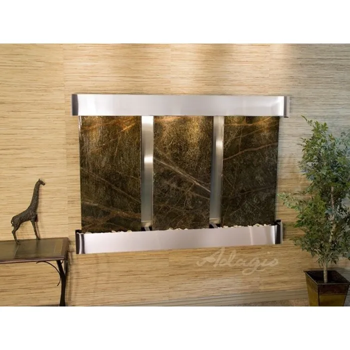 The Olympus Falls Collection offers the tranquility of water in motion falling over 3 beautiful Natural Slate, Marble, Featherstone, or Mirror surfaces. Adagio Water Features represents the best the industry has to offer. *Comes complete with Polished River Rocks, Halogen lighting, and 3 pumps. *Comes with EZ Installation Instructions and DVD. *On/Off pull chain allows you to run lights only, water only, or water and lights together. *Dimmer Switch allows you to adjust the lighting to produce the desired ambiance. *Optional: Stone Selection, LED lights w/ remote, Black Polished Pebbles, Customized Logo and Water Distillers are available. *