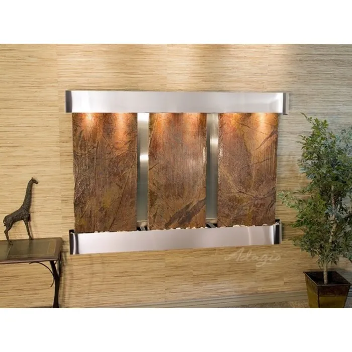 The Olympus Falls Collection offers the tranquility of water in motion falling over 3 beautiful Natural Slate, Marble, Featherstone, or Mirror surfaces. Adagio Water Features represents the best the industry has to offer. *Comes complete with Polished River Rocks, Halogen lighting, and 3 pumps. *Comes with EZ Installation Instructions and DVD. *On/Off pull chain allows you to run lights only, water only, or water and lights together. *Dimmer Switch allows you to adjust the lighting to produce the desired ambiance. *Optional: Stone Selection, LED lights w/ remote, Black Polished Pebbles, Customized Logo and Water Distillers are available. *
