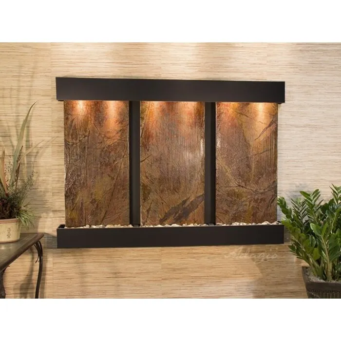 The Olympus Falls Collection offers the tranquility of water in motion falling over 3 beautiful Natural Slate, Marble, Featherstone, or Mirror surfaces. Adagio Water Features represents the best the industry has to offer. *Comes complete with Polished River Rocks, Halogen lighting, and 3 pumps. *Comes with EZ Installation Instructions and DVD. *On/Off pull chain allows you to run lights only, water only, or water and lights together. *Dimmer Switch allows you to adjust the lighting to produce the desired ambiance. *Optional: Stone Selection, LED lights w/ remote, Black Polished Pebbles, Customized Logo and Water Distillers are available. *