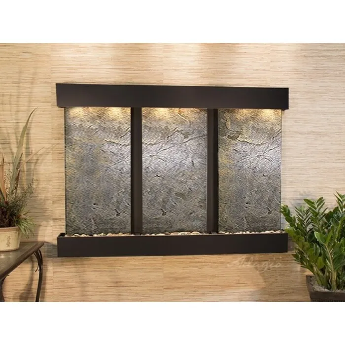The Olympus Falls Collection offers the tranquility of water in motion falling over 3 beautiful Natural Slate, Marble, Featherstone, or Mirror surfaces. Adagio Water Features represents the best the industry has to offer. *Comes complete with Polished River Rocks, Halogen lighting, and 3 pumps. *Comes with EZ Installation Instructions and DVD. *On/Off pull chain allows you to run lights only, water only, or water and lights together. *Dimmer Switch allows you to adjust the lighting to produce the desired ambiance. *Optional: Stone Selection, LED lights w/ remote, Black Polished Pebbles, Customized Logo and Water Distillers are available. *