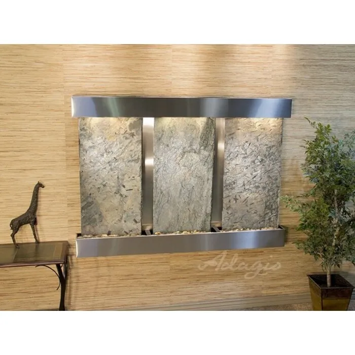 The Olympus Falls Collection offers the tranquility of water in motion falling over 3 beautiful Natural Slate, Marble, Featherstone, or Mirror surfaces. Adagio Water Features represents the best the industry has to offer. *Comes complete with Polished River Rocks, Halogen lighting, and 3 pumps. *Comes with EZ Installation Instructions and DVD. *On/Off pull chain allows you to run lights only, water only, or water and lights together. *Dimmer Switch allows you to adjust the lighting to produce the desired ambiance. *Optional: Stone Selection, LED lights w/ remote, Black Polished Pebbles, Customized Logo and Water Distillers are available. *