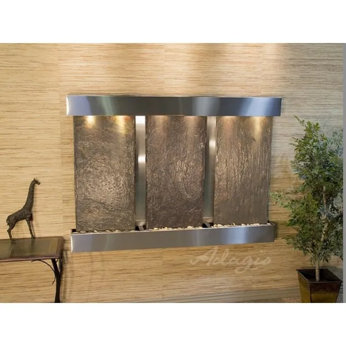 The Olympus Falls Collection offers the tranquility of water in motion falling over 3 beautiful Natural Slate, Marble, Featherstone, or Mirror surfaces. Adagio Water Features represents the best the industry has to offer. *Comes complete with Polished River Rocks, Halogen lighting, and 3 pumps. *Comes with EZ Installation Instructions and DVD. *On/Off pull chain allows you to run lights only, water only, or water and lights together. *Dimmer Switch allows you to adjust the lighting to produce the desired ambiance. *Optional: Stone Selection, LED lights w/ remote, Black Polished Pebbles, Customized Logo and Water Distillers are available. *