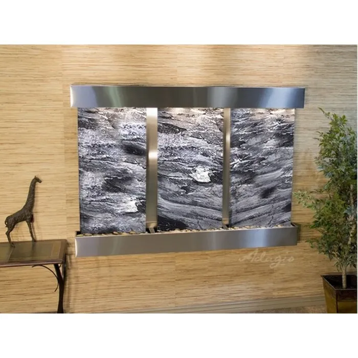 The Olympus Falls Collection offers the tranquility of water in motion falling over 3 beautiful Natural Slate, Marble, Featherstone, or Mirror surfaces. Adagio Water Features represents the best the industry has to offer. *Comes complete with Polished River Rocks, Halogen lighting, and 3 pumps. *Comes with EZ Installation Instructions and DVD. *On/Off pull chain allows you to run lights only, water only, or water and lights together. *Dimmer Switch allows you to adjust the lighting to produce the desired ambiance. *Optional: Stone Selection, LED lights w/ remote, Black Polished Pebbles, Customized Logo and Water Distillers are available. *