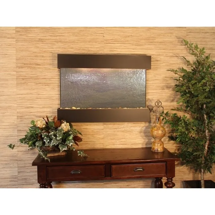 The Reflection Creek Collection offers the tranquility of water in motion falling over a beautiful Natural Slate, Featherstone, or Mirror surface. (Smallest Horizontal Feature) Adagio Water Features represents the best the industry has to offer. *Comes complete with Polished River Rocks, Halogen lighting, and 1 pump. *Comes with EZ Installation Instructions and DVD.*Simple On/Off switch is located on the top of the feature. *Optional: Stone Selection, LED lights w/ remote, Black Polished Pebbles, Customized Logo and Water Distillers are available. *