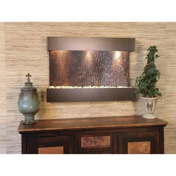 The Reflection Creek Collection offers the tranquility of water in motion falling over a beautiful Natural Slate, Featherstone, or Mirror surface. (Smallest Horizontal Feature) Adagio Water Features represents the best the industry has to offer. *Comes complete with Polished River Rocks, Halogen lighting, and 1 pump. *Comes with EZ Installation Instructions and DVD.*Simple On/Off switch is located on the top of the feature. *Optional: Stone Selection, LED lights w/ remote, Black Polished Pebbles, Customized Logo and Water Distillers are available. *