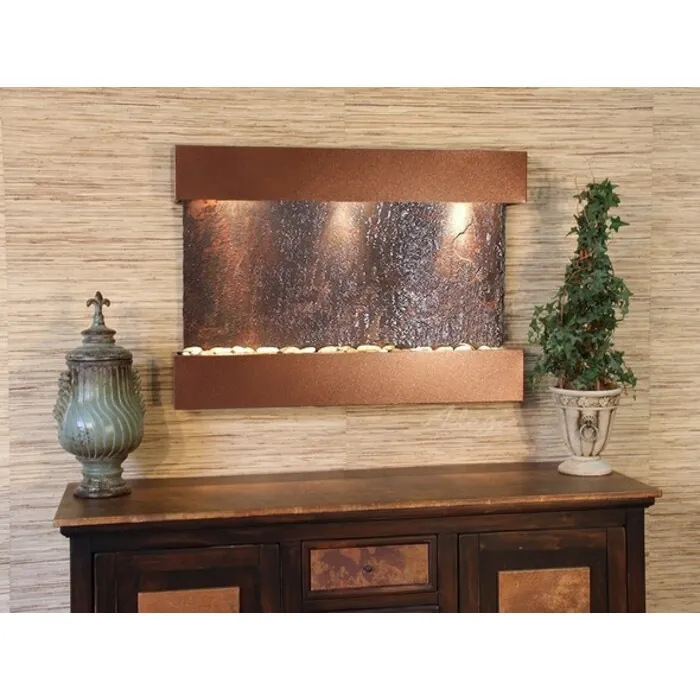 The Reflection Creek Collection offers the tranquility of water in motion falling over a beautiful Natural Slate, Featherstone, or Mirror surface. (Smallest Horizontal Feature) Adagio Water Features represents the best the industry has to offer. *Comes complete with Polished River Rocks, Halogen lighting, and 1 pump. *Comes with EZ Installation Instructions and DVD.*Simple On/Off switch is located on the top of the feature. *Optional: Stone Selection, LED lights w/ remote, Black Polished Pebbles, Customized Logo and Water Distillers are available. *