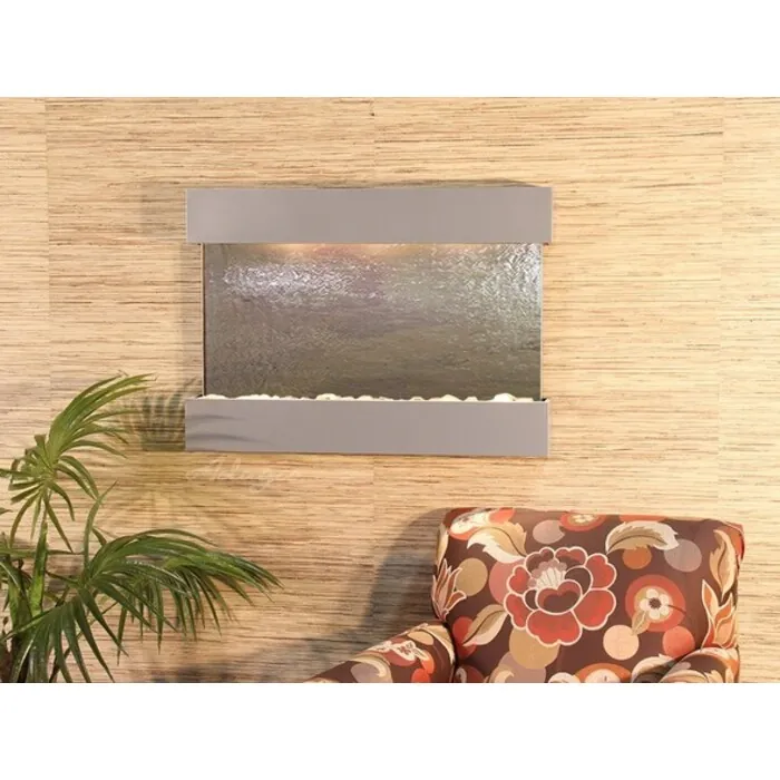 The Reflection Creek Collection offers the tranquility of water in motion falling over a beautiful Natural Slate, Featherstone, or Mirror surface. (Smallest Horizontal Feature) Adagio Water Features represents the best the industry has to offer. *Comes complete with Polished River Rocks, Halogen lighting, and 1 pump. *Comes with EZ Installation Instructions and DVD.*Simple On/Off switch is located on the top of the feature. *Optional: Stone Selection, LED lights w/ remote, Black Polished Pebbles, Customized Logo and Water Distillers are available. *