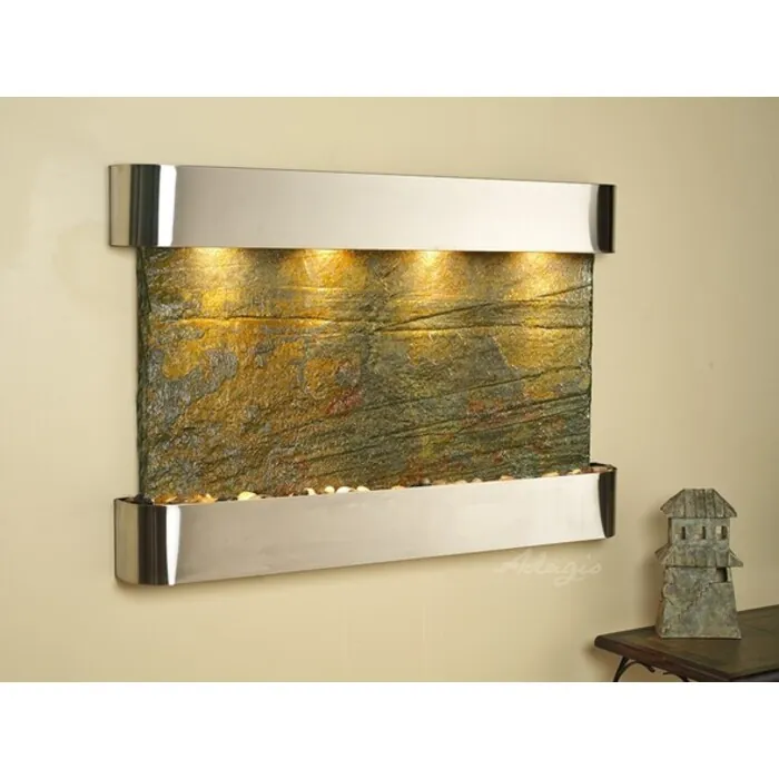 The Sunrise Springs Collection offers the tranquility of water in motion falling over a beautiful Natural Slate, Marble, Travertine, Featherstone, or Mirror surface. Adagio Water Features represents the best the industry has to offer. *Comes complete with Polished River Rocks, Halogen lighting, and 1 pump. *Comes with EZ Installation Instructions and DVD. *On/Off pull chain allows you to run lights only, water only, or water and lights together. *Dimmer Switch allows you to adjust the lighting to produce the desired ambiance. *Optional: Stone Selection, LED lights w/ remote, Black Polished Pebbles, Customized Logo and Water Distillers are available. *
