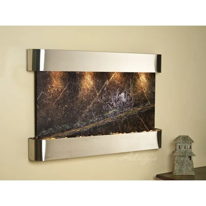 The Sunrise Springs Collection offers the tranquility of water in motion falling over a beautiful Natural Slate, Marble, Travertine, Featherstone, or Mirror surface. Adagio Water Features represents the best the industry has to offer. *Comes complete with Polished River Rocks, Halogen lighting, and 1 pump. *Comes with EZ Installation Instructions and DVD. *On/Off pull chain allows you to run lights only, water only, or water and lights together. *Dimmer Switch allows you to adjust the lighting to produce the desired ambiance. *Optional: Stone Selection, LED lights w/ remote, Black Polished Pebbles, Customized Logo and Water Distillers are available. *