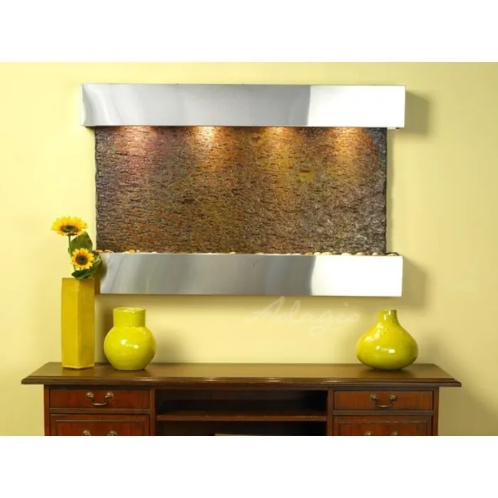 The Sunrise Springs Collection offers the tranquility of water in motion falling over a beautiful Natural Slate, Marble, Travertine, Featherstone, or Mirror surface. Adagio Water Features represents the best the industry has to offer. *Comes complete with Polished River Rocks, Halogen lighting, and 1 pump. *Comes with EZ Installation Instructions and DVD. *On/Off pull chain allows you to run lights only, water only, or water and lights together. *Dimmer Switch allows you to adjust the lighting to produce the desired ambiance. *Optional: Stone Selection, LED lights w/ remote, Black Polished Pebbles, Customized Logo and Water Distillers are available. *