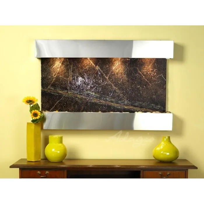 The Sunrise Springs Collection offers the tranquility of water in motion falling over a beautiful Natural Slate, Marble, Travertine, Featherstone, or Mirror surface. Adagio Water Features represents the best the industry has to offer. *Comes complete with Polished River Rocks, Halogen lighting, and 1 pump. *Comes with EZ Installation Instructions and DVD. *On/Off pull chain allows you to run lights only, water only, or water and lights together. *Dimmer Switch allows you to adjust the lighting to produce the desired ambiance. *Optional: Stone Selection, LED lights w/ remote, Black Polished Pebbles, Customized Logo and Water Distillers are available. *