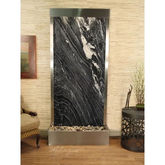The Tranquil River Collection offers the tranquility of water in motion falling over a beautiful Natural Marble, Featherstone, Glass, or Mirror surface. Adagio Water Features represents the best the industry has to offer. *Comes complete with Polished River Rocks, Halogen lighting, and 1 pump. *Comes with EZ Installation Instructions and DVD. *Center Mounts are good for room dividers and are movable! *Flush Mounts are best up against the wall and are movable. *Optional: Stone Selection, LED lights w/ remote, Black Polished Pebbles, Customized Logo and Water Distillers are available. *