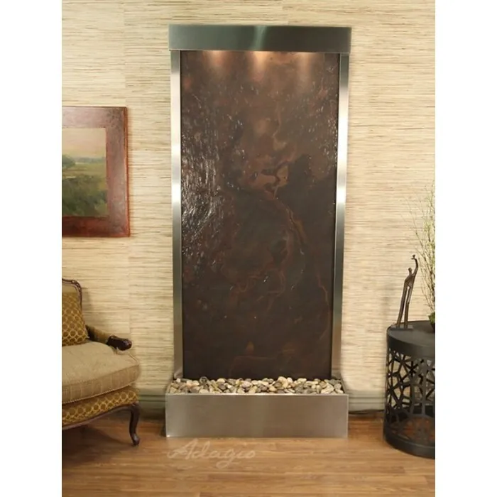 The Tranquil River Collection offers the tranquility of water in motion falling over a beautiful Natural Marble, Featherstone, Glass, or Mirror surface. Adagio Water Features represents the best the industry has to offer. *Comes complete with Polished River Rocks, Halogen lighting, and 1 pump. *Comes with EZ Installation Instructions and DVD. *Center Mounts are good for room dividers and are movable! *Flush Mounts are best up against the wall and are movable. *Optional: Stone Selection, LED lights w/ remote, Black Polished Pebbles, Customized Logo and Water Distillers are available. *