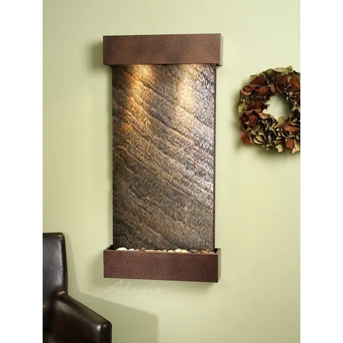 The Whispering Creek Collection offers the tranquility of water in motion falling over a beautiful Natural Slate, Featherstone, or Mirror surface. Adagio Water Features represents the best the industry has to offer. *Comes complete with Polished River Rocks, Halogen lighting, and 1 pump. *Comes with EZ Installation Instructions and DVD. *Simple On/Off switch is located on the top of the feature. *Optional: Stone Selection, LED lights w/ remote, Black Polished Pebbles, Customized Logo and Water Distillers are available. *