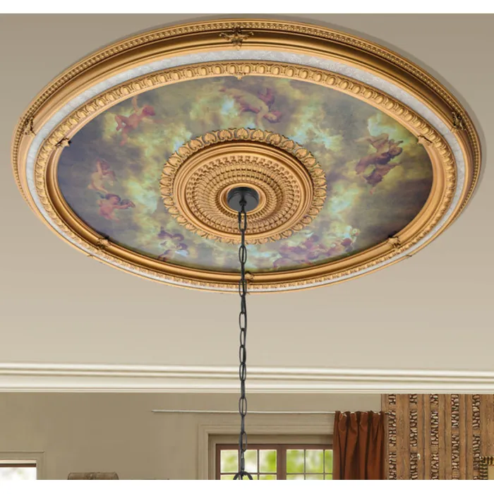 This timeless large. Oval ceiling medallion inspired by the grandeur. Of european elegance comes fully finished and assembled , cast in light weight non shrinking durable poly styrene. This product enables the. Owner to install in a relatively easy process a completely finished 3 dimensional ceiling coffer. Adding sought after architectural detail to plain. Open vast ceiling spaces and a crowning elegance to a fine chandelier installation. They add beauty for the. Owner to enjoy as well as value to your investment . prior to thier creation this affect would have been a very messy and expensive addition requiring carpenters and finishers. installation. Of this design is made even easier as the. Outer ring is designed with raised cabachon detailing and in the. Outer design intermittent spaces have been designed to accept simple hollow wall anchors. Or sheetrock screws , decorative caps are even provided that will cover the screw heads when installed and complete the finished. Outer ring cabachon elements