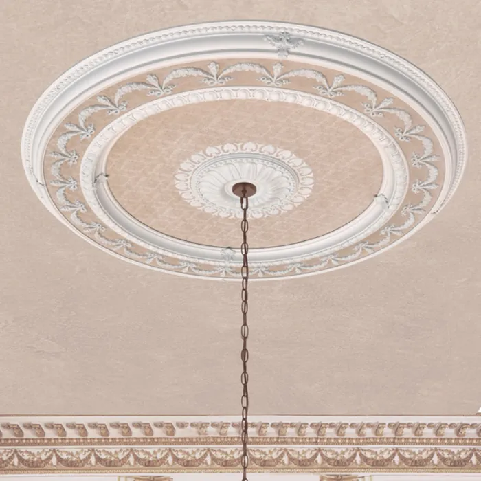 This timeless large round classic ceiling medallion designed with understated elegance in mind comes fully finished and assembled , cast in light weight non shrinking durable poly styrene. This product enables the. Owner to install in a relatively easy process a completely finished 3 dimensional ceiling coffer. Adding sought after architectural detail to plain. Open vast ceiling spaces and a crowning elegance to a fine chandelier installation. They add beauty for the. Owner to enjoy as well as value to your investment . prior to thier creation this affect would have been a very messy and expensive addition requiring carpenters and finishers. installation. Of this design is made even easier as the. Outer ring is designed with raised cabachon detailing and in the. Outer design intermittent spaces have been designed to accept simple hollow wall anchors. Or sheetrock screws , decorative caps are even provided that will cover the screw heads when installed and complete the finished. Outer ring cabachon elements