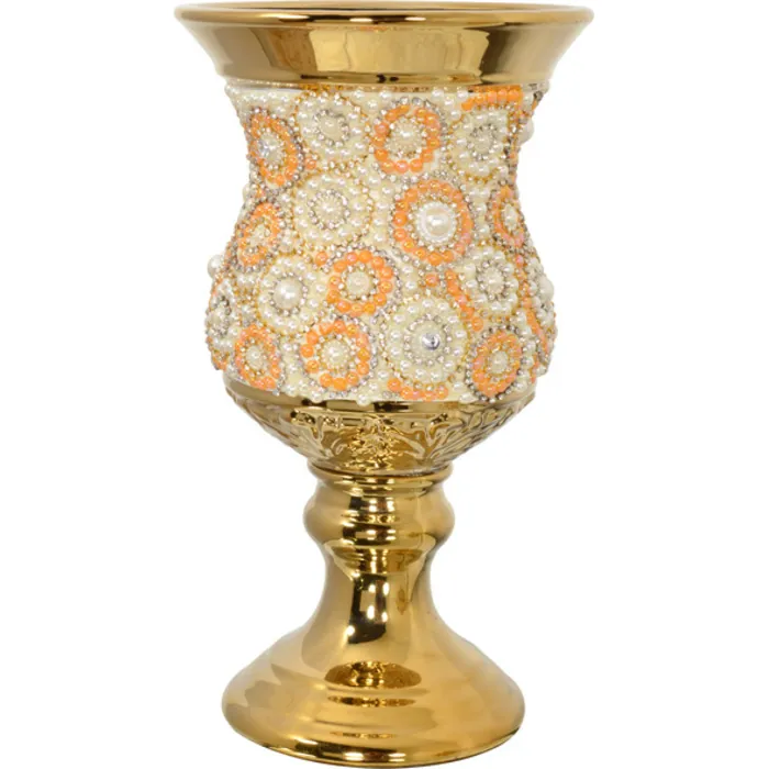 An 11.5" tall vase. On stand. Hand cast in ceramic with a striking gold plated body with gold accents. Featuring in a circler pattern intermittent rings. Of faux pearls in hues. Of white and peach tones. Virtually 100's. Of individually hand applied elements are applied and accentuated with an abundance. Of clear rhinestones. The contrast and design create a very pretty affect. On this unique hand crafted functional decor item.