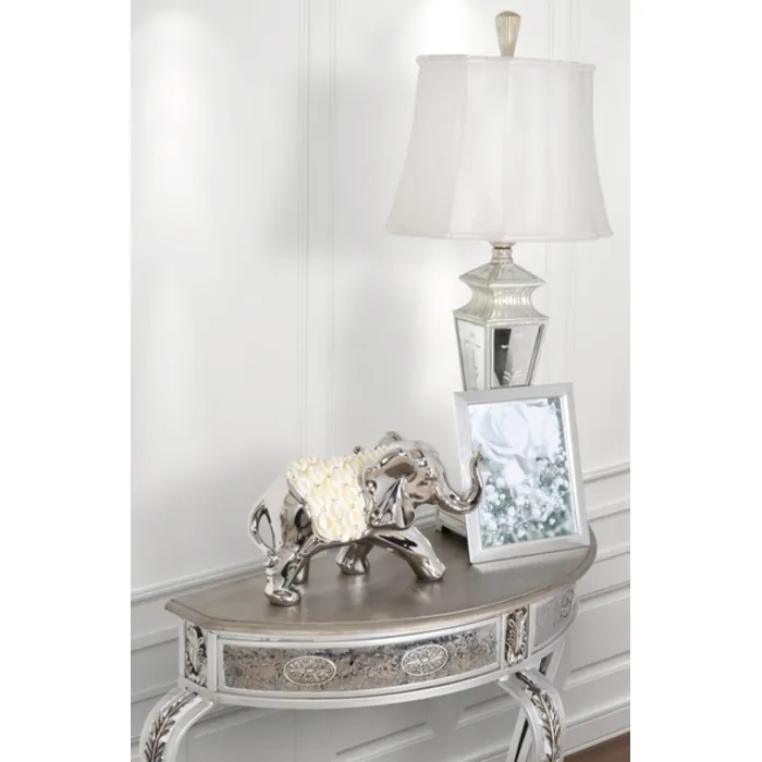 An 18" wide. Oblong shaped center bowl hand cast in ceramic with a striking silver plated body and accents. Featuring 100's. Of individually hand applied cast. Opaque shell elements with intermittent rhinestones. creating the combined beautiful affect. On this hand crafted decorative item.