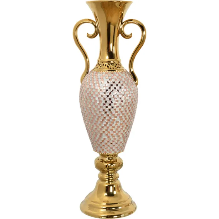 A large impressive vase at 29.5" tall, making it versatile as either a display. Object. Of art. On its. Own. Or a functioning urn. Hand cast in ceramic with a striking gold plated body and accents. Featuring 100's. Of individually hand applied elements. Or rose and clear rhinestones intermittently set. The contrast and design create a very striking affect. On this unique hand crafted functional decor item.