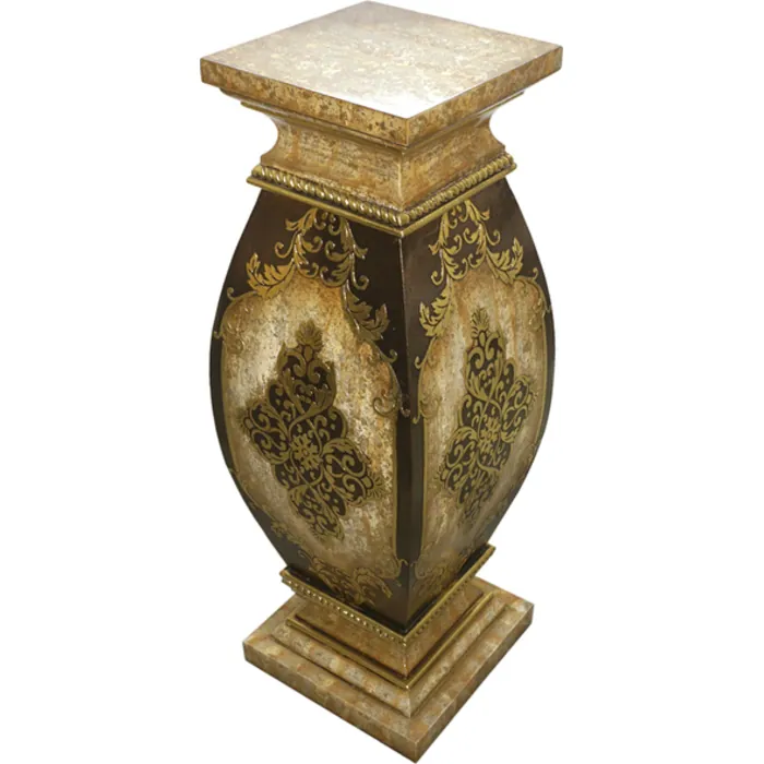 A 35" tall 12" square top pedestal , from. Our house. Of medici collection. A collection inspired by the art. Of florence and italian renaissance grandeur. With its raised details, the hand finishing in rich jeweled tones create an interresting contrast with the varigated golds, silvers and antiquing. Hand made in mdf wood board, utilized to insure long lasting stability in all climates.